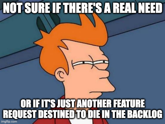 These days I make an effort to engage with any feature request that isn’t (a) already aligned to solidly-planned enhancements and (b) isn’t clearly spelled out why this matters to the customer. Our “feature request” systems aren’t great for even indirect communication with the originating customer, so many of these conversations get delayed for months if ever. I’ll increasingly root around Salesforce and Slack to reach out to associated Success Manager or Solution Engineer, but that’s still lacking the fidelity of the direct conversation with the person-with-the-problem. It’s a journey.